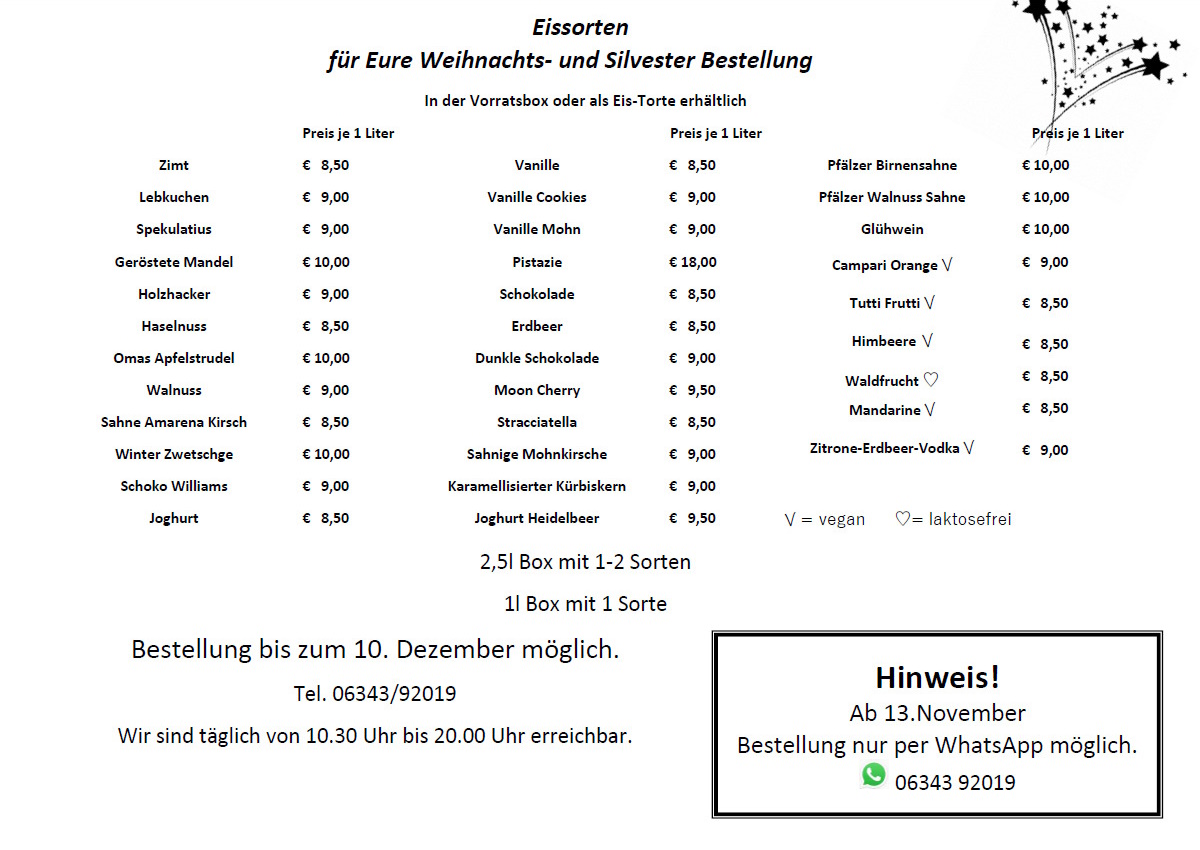 10 Tage im Voraus. Bestellungen können ausschließlich direkt persönlich bei uns im Eiscafé entgegengenommen werden.